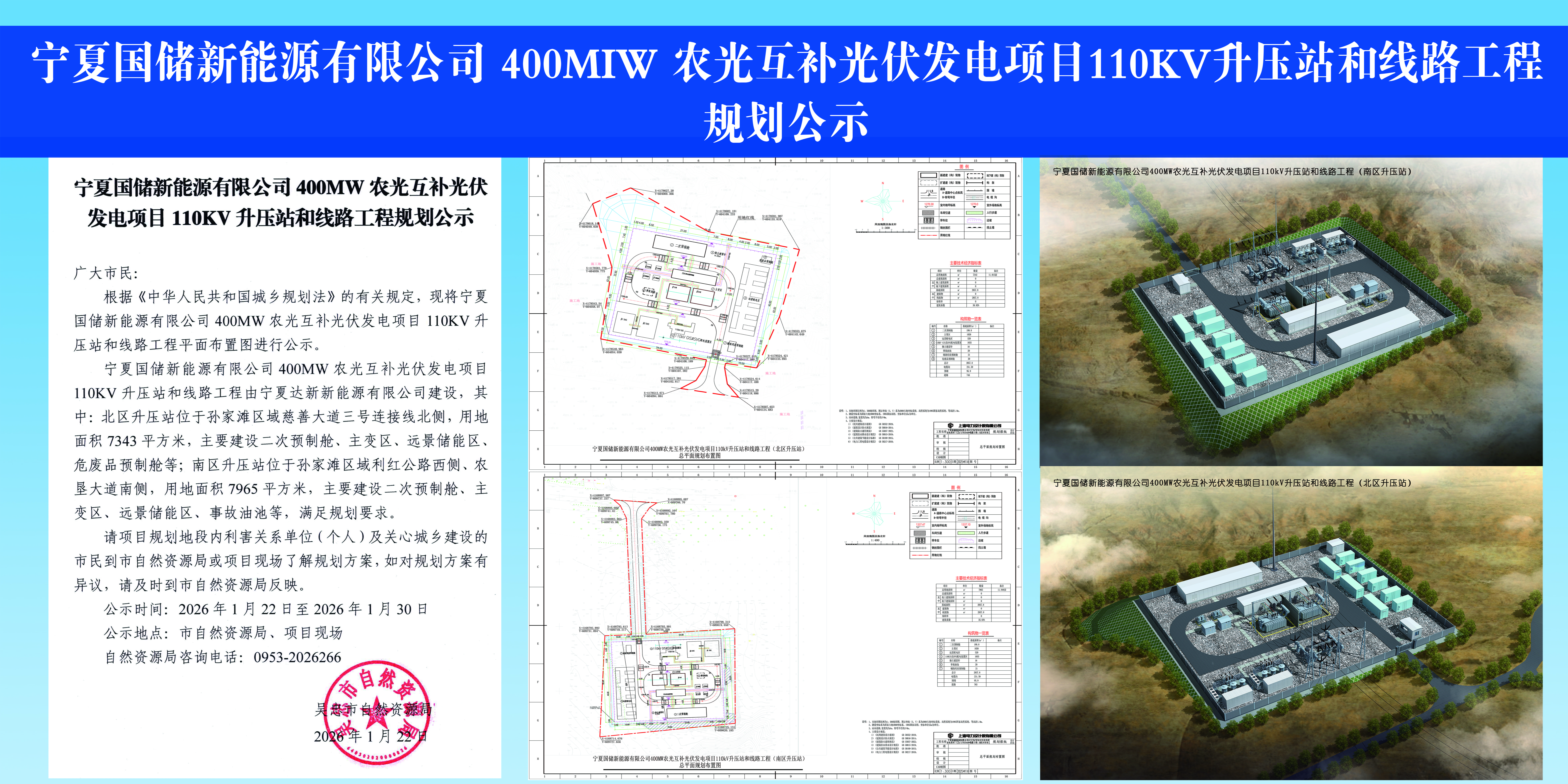 宁夏国储新能源有限公司400MW农光互补光伏发电项目110KV升压站和线路工程规划公示