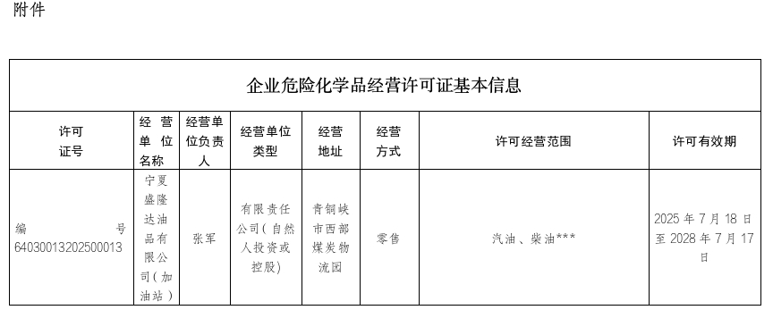 根据中宁夏盛隆达油品有限公司(加油站)关于危险化学品经营许可证注销申请,依据《危险化学品经营许可证管理办法》(国家安全生产监督管理总局令第55号)第二十七条规定,现对终止危险化学品经营活动的宁夏盛隆达油品有限公司(加油站)危险化学品经营许可证予以注销。