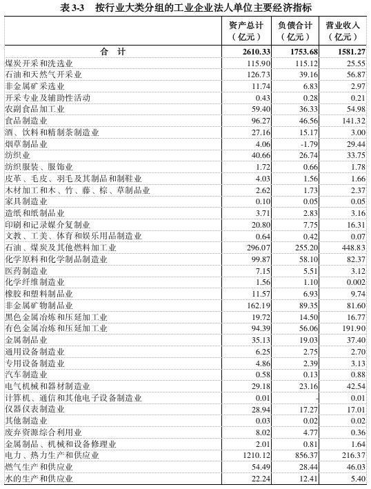 在工业企业法人单位从业人员中,采矿业15112人,制造业56674人,电力、热力、燃气及水生产和供应业7743人,分别占19.0%、71.3%和9.7%。在工业行业大类中,石油和天然气开采业,石油、煤炭及其他燃料加工业,非金属矿物制品业从业人员数位居前三位,分别占15.2%、9.1%和9.0%(详见表3-2)。