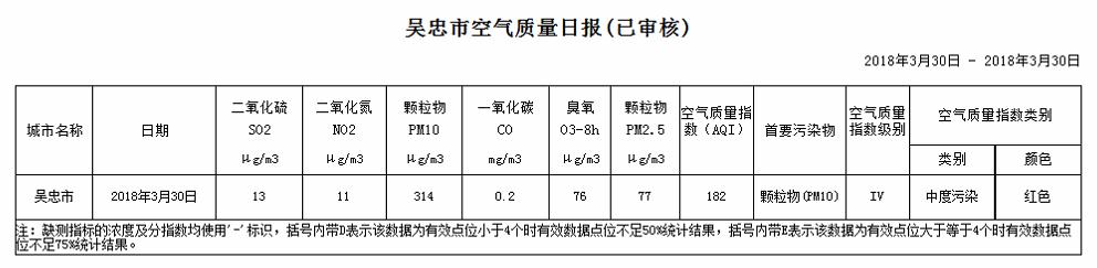 2018年3月30日吴忠市空气质量日报