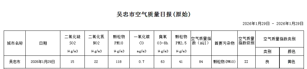 2026年1月29日吴忠市空气质量日报