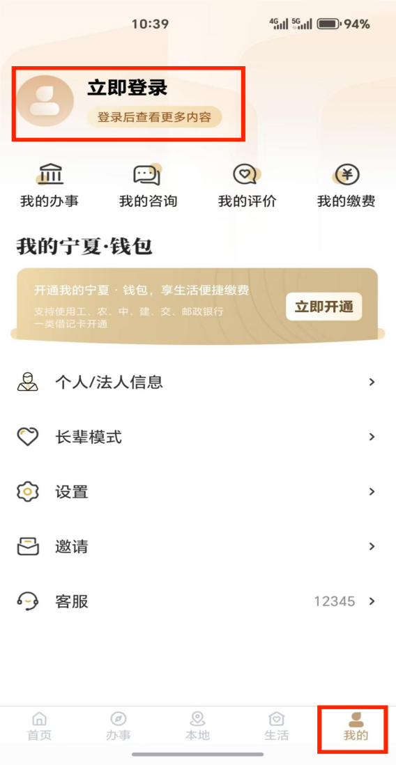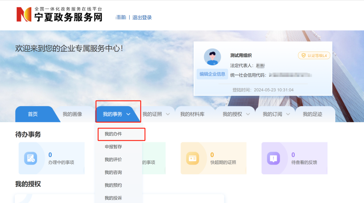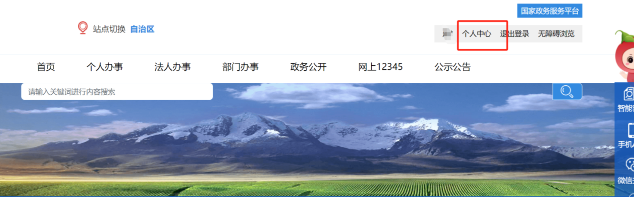 1.申请人登录宁夏政务服务网后,点击右上角个人中心。