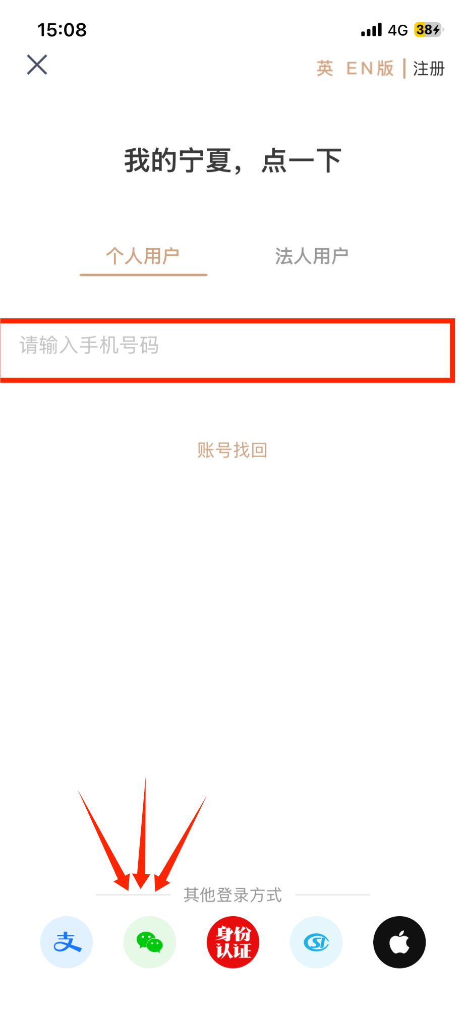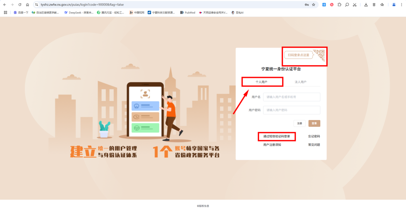 2.点击右上角登录按钮,选择个人用户,可通过输入用户名密码、手机号和短信验证码、我的宁夏APP扫码3种方式登录。(未注册法人账户的先进行注册)