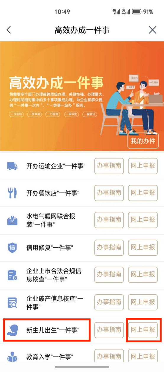 3.申报新生儿出生“一件事”,点击“网上申报”按钮。