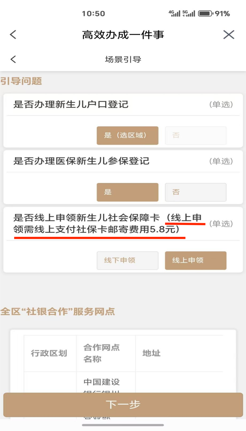 5.场景引导中选择要办理的业务(目前可选择办理新生儿入户、城乡居民医保参保登记、社保卡申领),然后点击下一步。