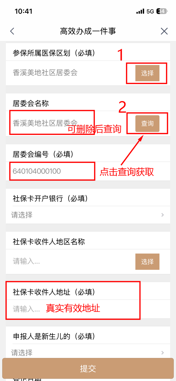 2.医保参保信息填写时请先选择参保所属区划,点击查询按钮获取居委会编号。(若查询时弹出不成功的提示,请删除居委会名称后重新点击查询按钮),滑动鼠标到底部,然后点击“提交申请”按钮。