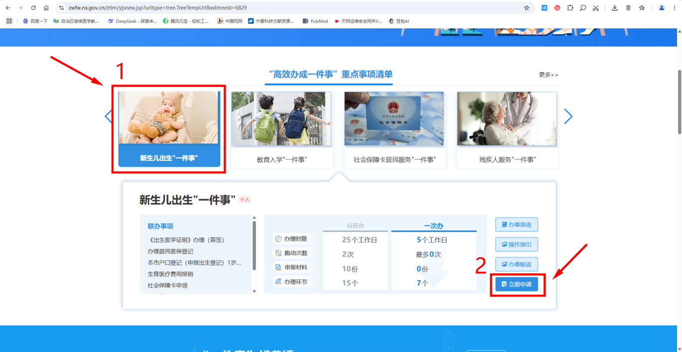 2.向下滑动页面,点击新生儿出生“一件事”,然后点击“立即申请”按钮。