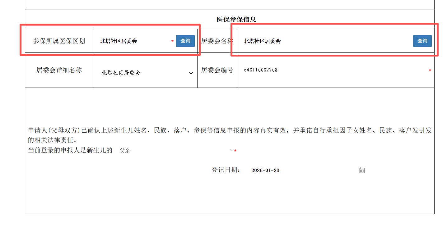填写注意:居委会编号获取需要选择参保所属区划,然后点击居委会名称后的“查询”按钮。若无法获取到居委会编码,可清空居委会名称中的文字后点击“查询”按钮。