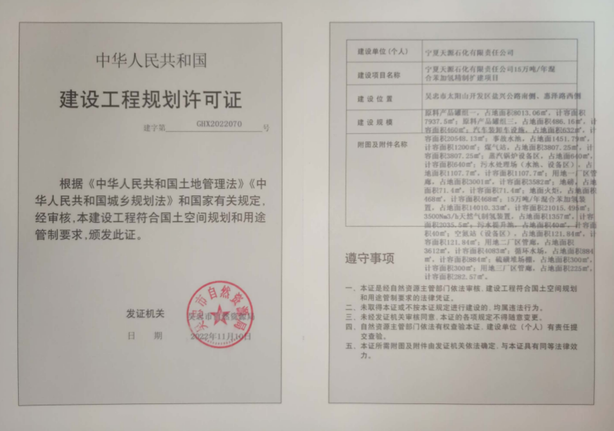 宁夏天源石化有限责任公司15万吨/年混合苯加氢精制扩建项目建设工程规划许可证