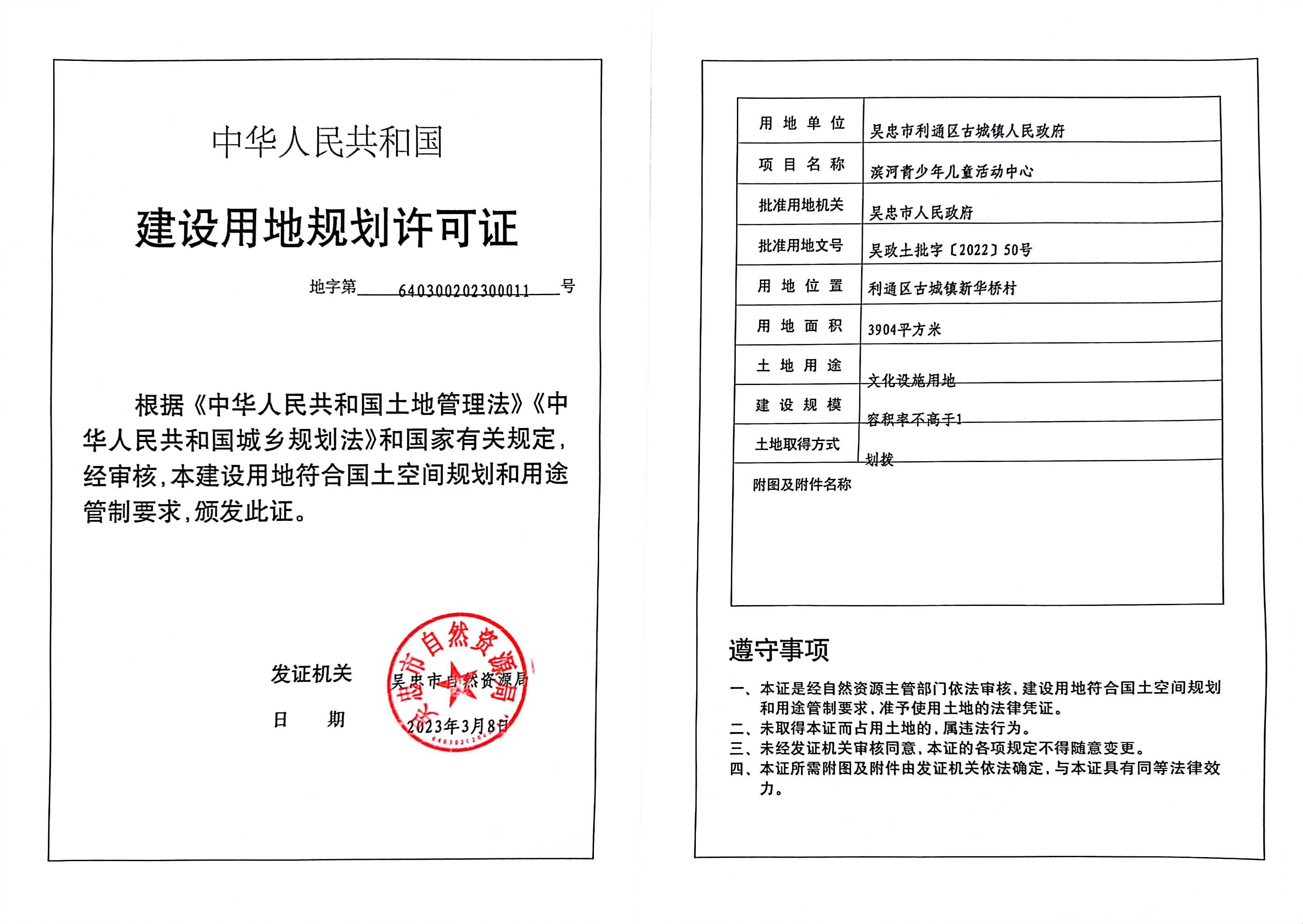 滨河青少年儿童活动中心建设用地规划许可证