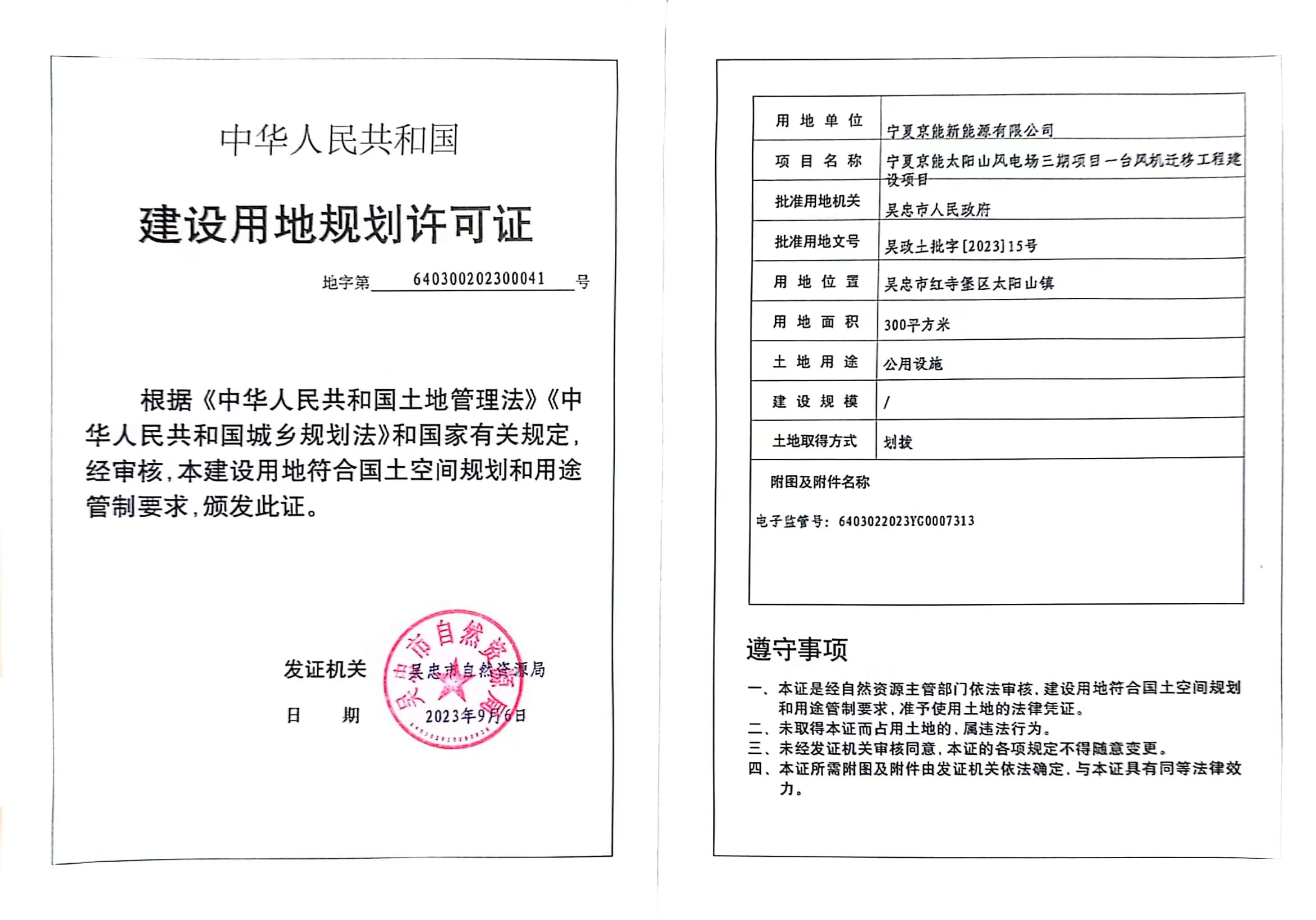 宁夏京能太阳山风电场三期项目一台风机迁移工程建设项目建设用地规划许可证