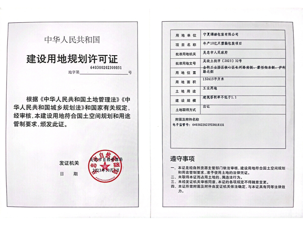 宁夏璟赫包装有限公司年产10亿只塑编包装项目建设用地规划许可证