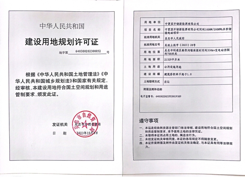 宁夏国开储新能源有限公司同利100MW/200MWh共享储能电站项目建设用地规划许可证