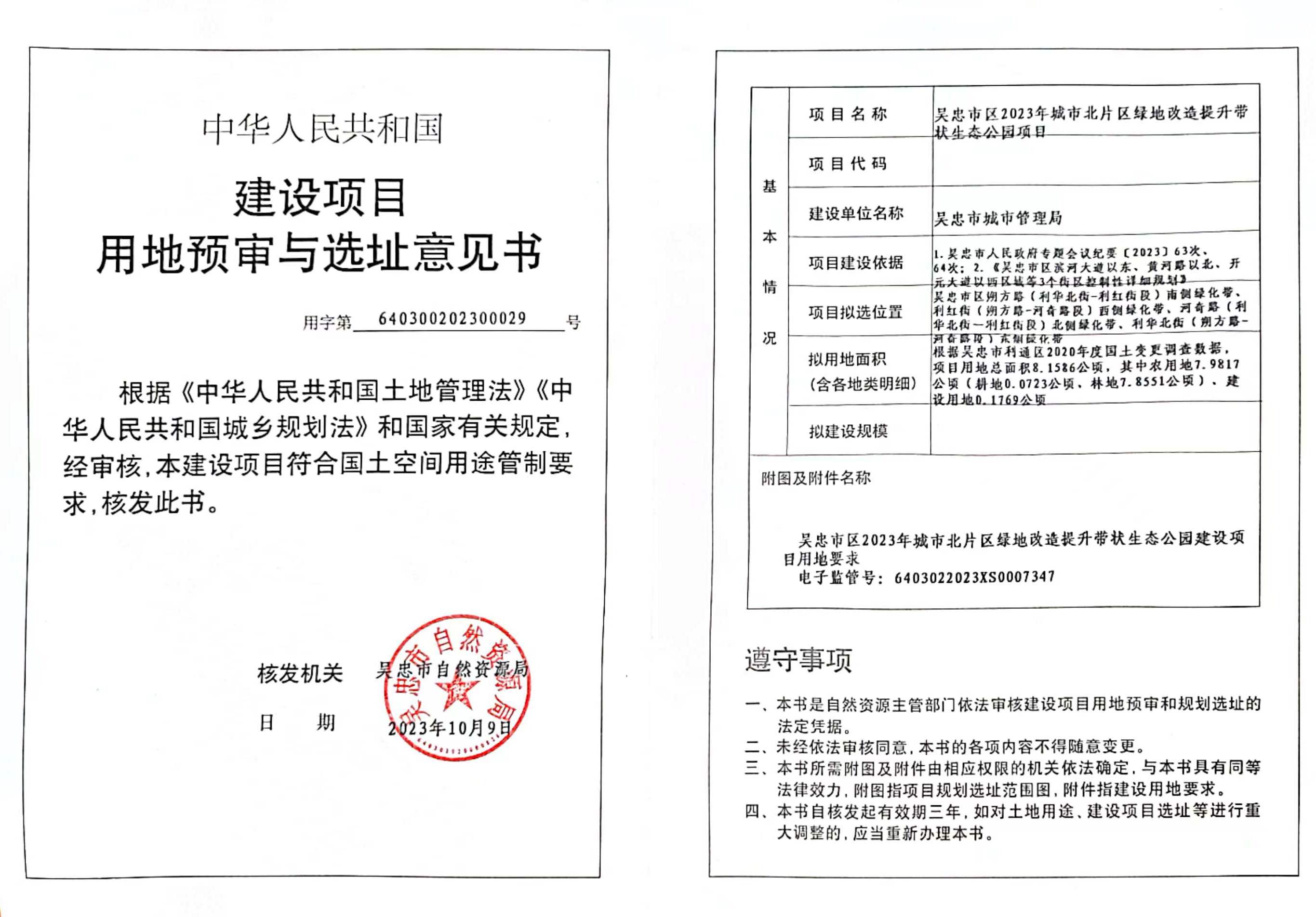 吴忠市区2023年城市北片区绿地改造提升带状生态公园项目建设项目预审与选址意见书