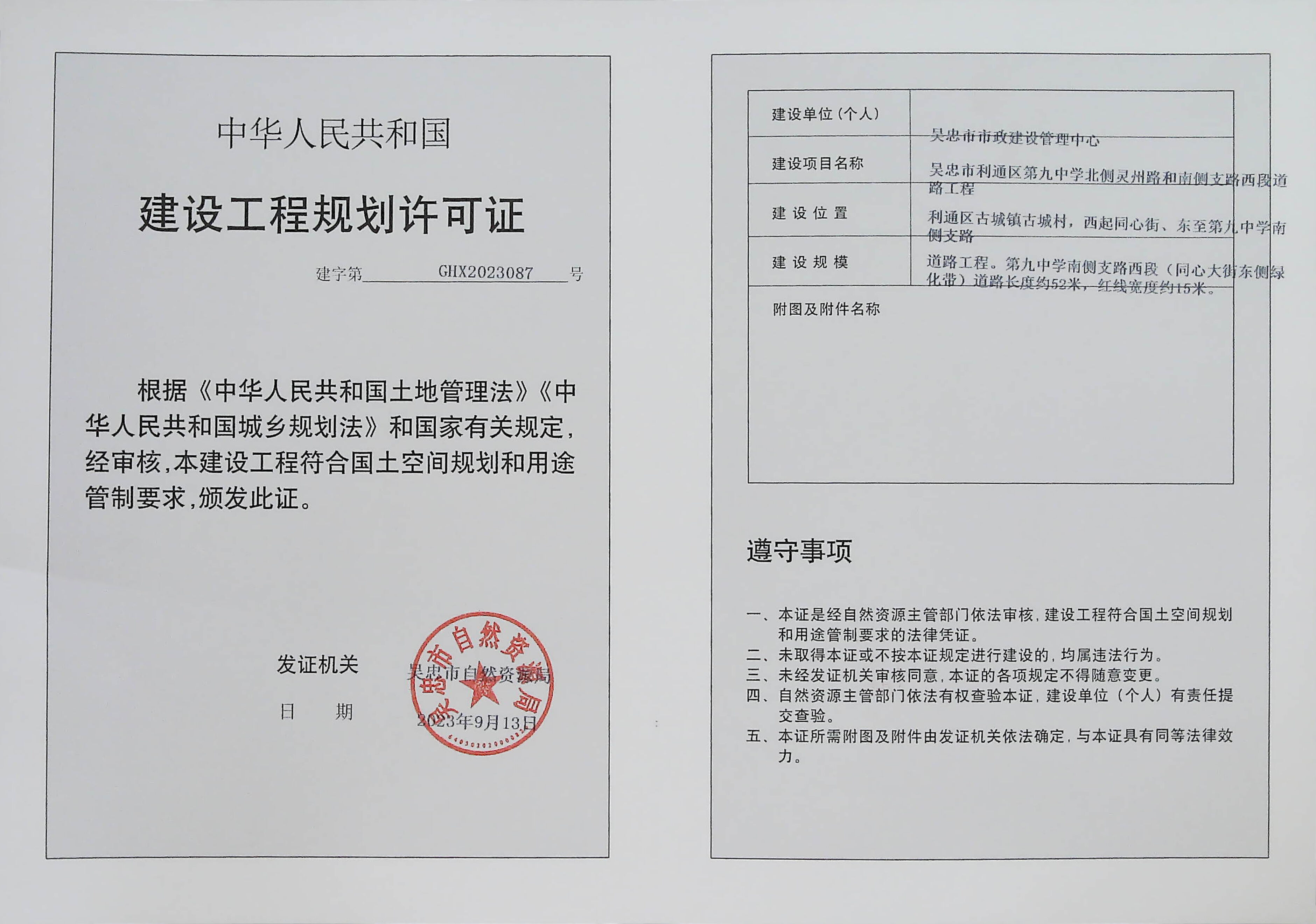 吴忠市利通区第九中学北侧灵州路和南侧支路西段道路工程建设工程规划许可证