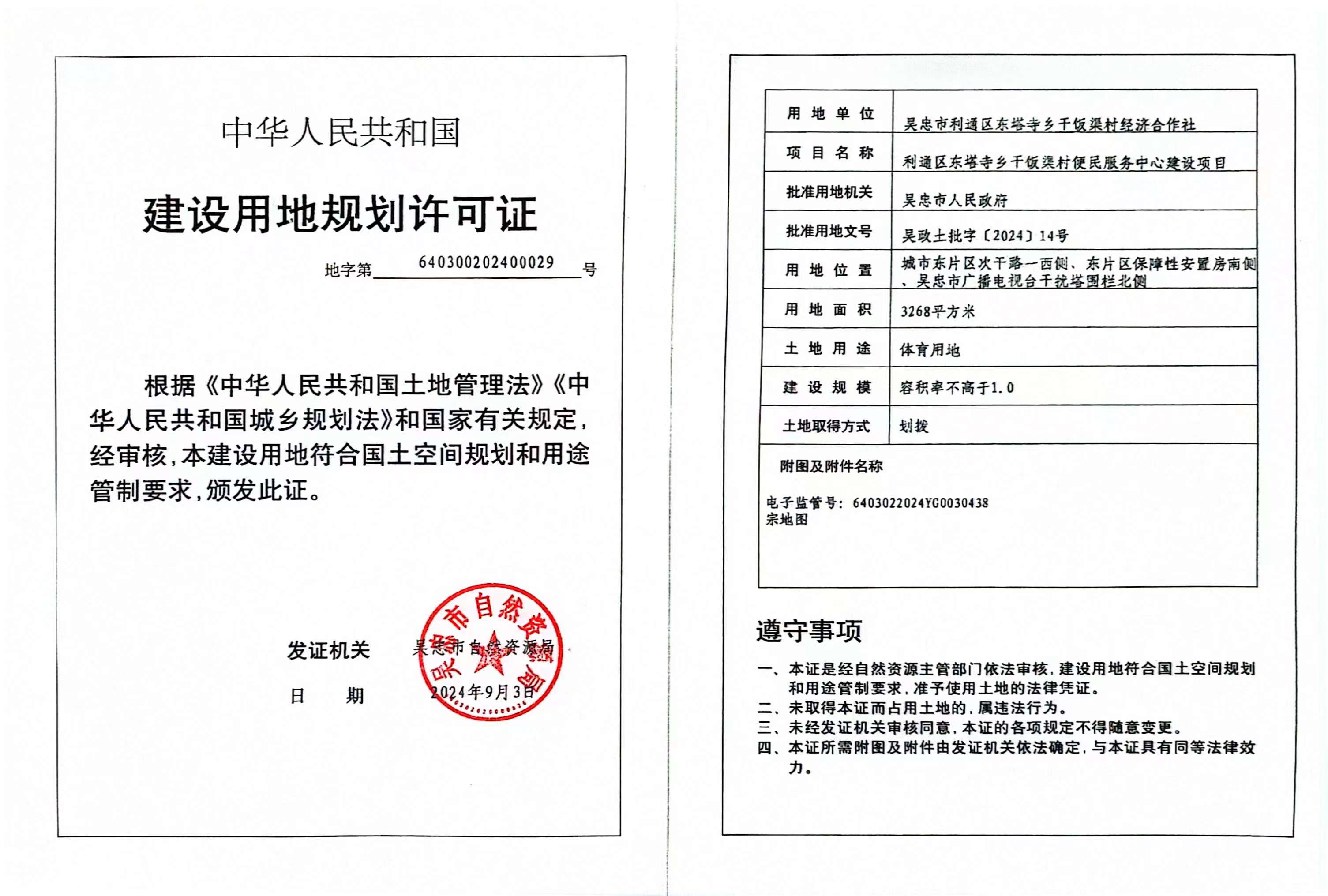 利通区东塔寺乡干饭渠村便民服务中心建设项目建设用地规划许可证