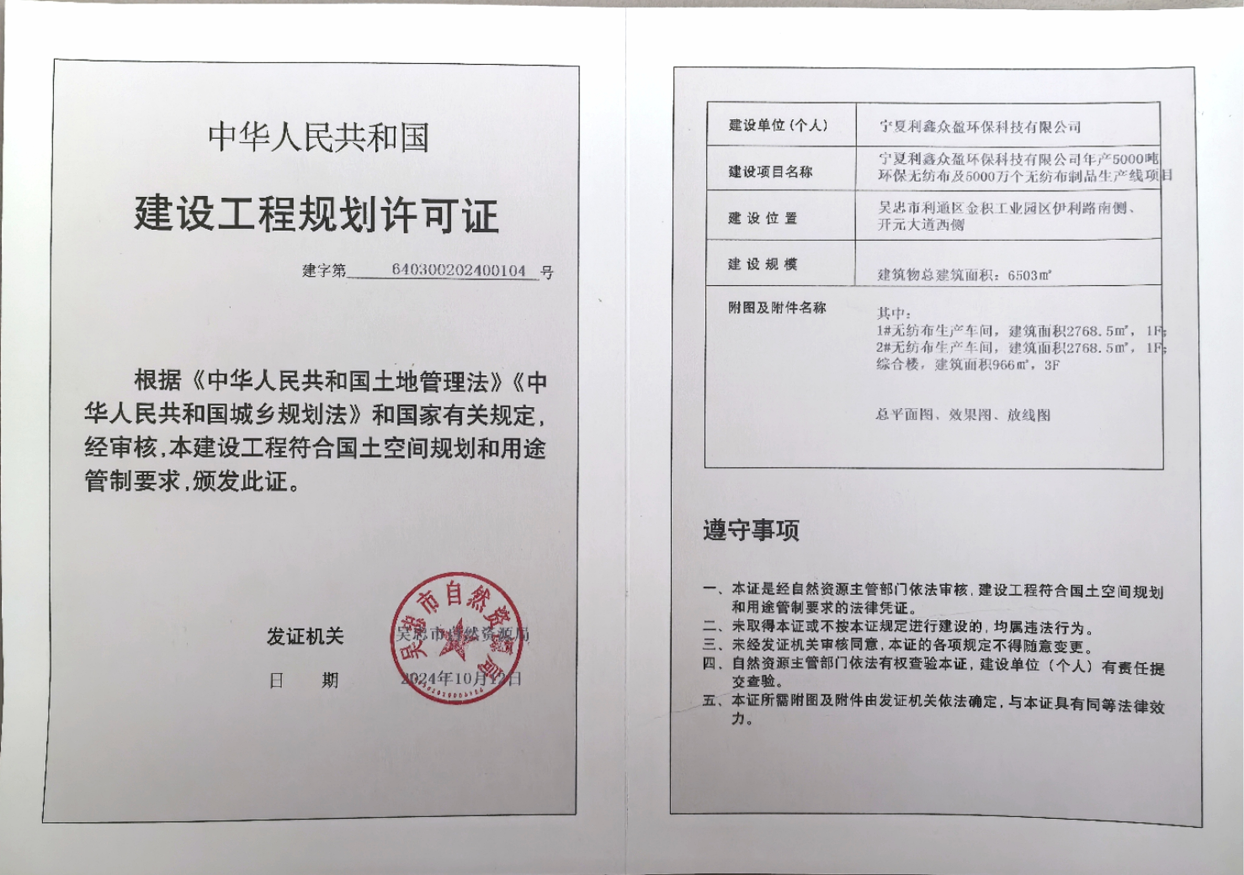 宁夏利鑫众盈环保科技有限公司年产5000吨环保无纺布及5000万个无纺布制品生产线项目建设工程规划许可证