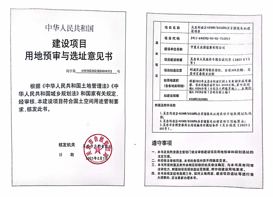 吴忠利通区400MW/800MWh共享储能电站建设项目建设项目用地预审与选址意见书